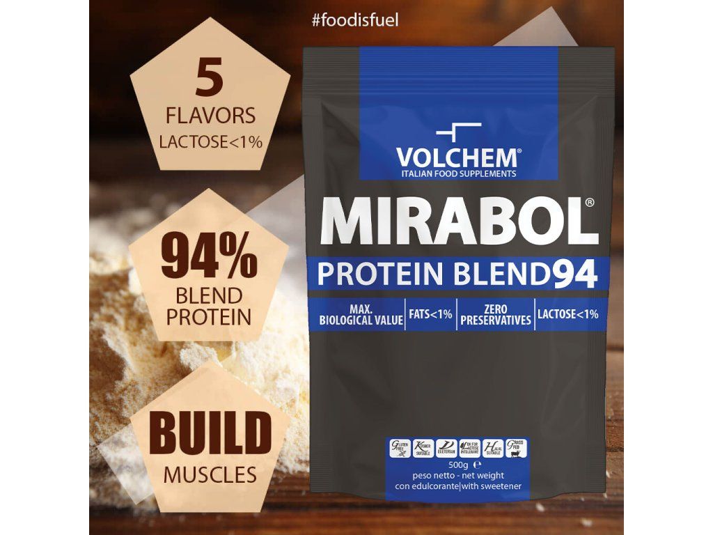VOLCHEM Mirabol Protein 94 obsahuje kombinaci kaseinu, syrovátkového proteinového izolátu a vaječného proteinu s koncentrací 94 % bílkovin v sušině. Obsah laktózy je meně než 1 %.