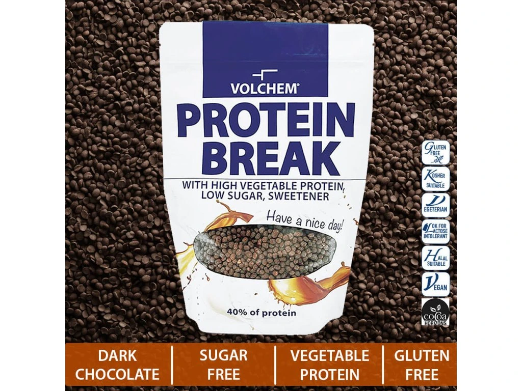 Vylepšete si snídani nebo svačinku o chutný zdroj bílkovin. Protein Break Dark obsahuje 40% rostlinných bílkovin. Neobsahuje laktózu, lepek, živočišné produkty. Obsah rychlých cukrů je pouze 0,4 g ve 100 g výrobku. Čokoláda použitá k ochucení obsahuje minimálně 54% kakaa.