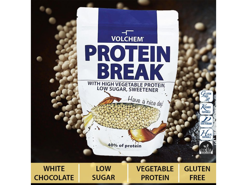 Protein Break White jsou proteinové kuličky obsahující 40% sójové bílkoviny a velmi nízký obsah rychlých cukrů (2 g v jedné 30 g dávce). Kombinace vysokého podílu bílkoviny a rostlinných tuků navozuje pocit sytosti. Obsah laktózy je velmi nízký. Neobsahuje lepek.